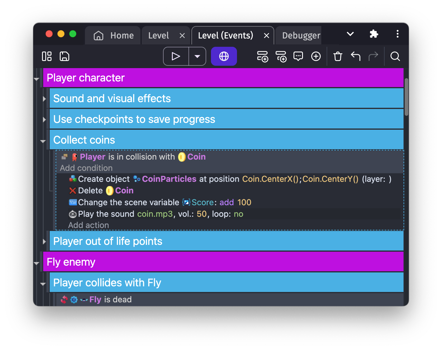 Groups are used to organize and structure your events. They are useful to put together a set of events related to the same concept and make the Events Sheet more readable when it's growing.